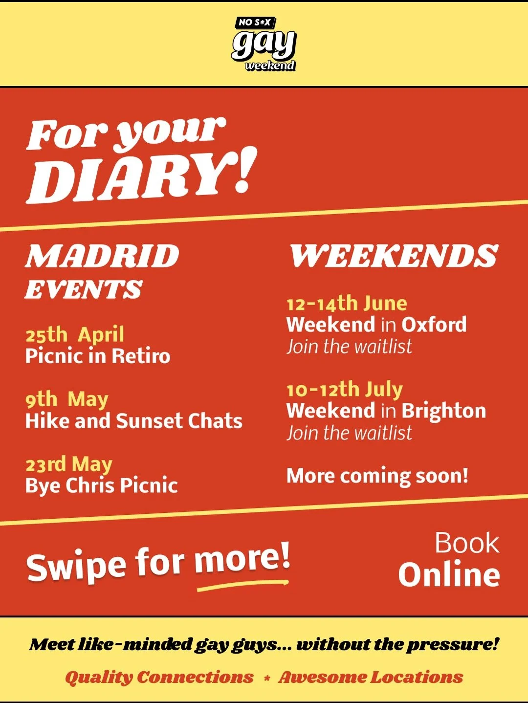 Weekends away in non-gay centred but fabulous destinations where we can connect and make friends - and possibly more - but with one rule… no sex!